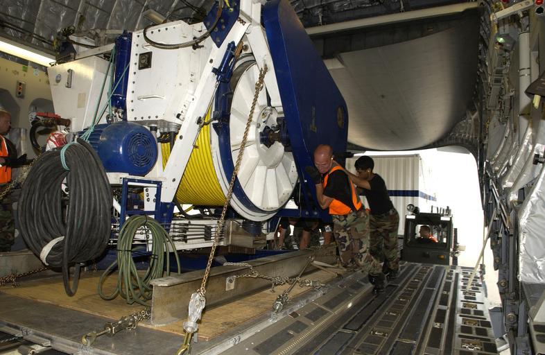 | Keywords: US Navy 050805-F-M8968-010 Deep Drone ROV is prepared for deployment.jpg  en Andrews Air Force Base AFB Md August 5 2005 - Members of the 89th Aerial Port Squadron APS Andrews AFB and 32nd APS Air Reserve Squadron Pittsburgh Pa load Deep Drone 8000 support equipment onto a C-17 Globemaster III from Charleston South Carolina The U S Navy Supervisor of Salvage and Diving SUPSALV is deploying a Deep Drone 8000 Remotely Operated Vehicle ROV capable of operating at a depth up to 8000 feet The Deep Drone 8000 has a target locating sonar and two tool manipulators capable of working with tools and attaching rigging The Navy and Air Force are transporting Deep Drone in an effort to assist the rescue of seven Russian Sailors trapped on the ocean floor in a mini-submarine off the Kamchatka Peninsula U S Air Force photo by SSgt Christopher J Matthews RELEASED 050805-F-M8968-010 Navy http //www navy mil/view_image asp id 26917 U S Navy photo PD-USGov-Military-Navy Joint Base Andrews Naval Air Facility Deep Drone Transport of vehicles by Boeing C-17 Globemaster III |