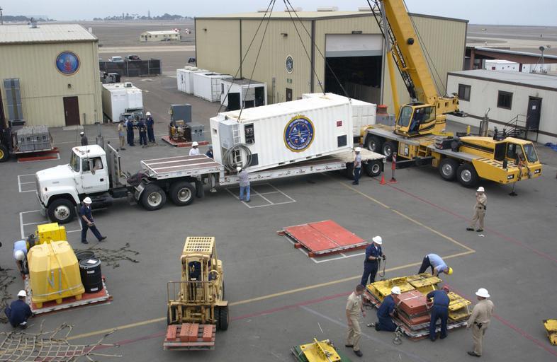 Keywords: US Navy 050805-N-1995C-105 Sailors assigned to the U.S. Navy's Unmanned Vehicle (UMV) Detachment, located at Naval Air Station North Island, make preparations to load Super Scorpio.jpg en San Diego Calif Aug 5 2005 - Sailors assigned to the U S Navy's Unmanned Vehicle UMV Detachment located at Naval Air Station North Island make preparations to load Super Scorpio a robotic rescue vehicle aboard an Air Force C-5 Galaxy aircraft The Navy is transporting two of the remotely operated vehicles in an effort to assist the rescue of seven Russian Sailors trapped on the ocean floor in a mini-submarine off the Kamchatka Peninsula The Super Scorpios and a team of U S Navy technicians are to be flown from San Diego to Petropavolvsk then transported by truck to be embarked on a Russian ship before making a descent to the stranded submarine U S Navy photo by Chief Photographer's Mate Steven Cooke RELEASED 2005-08-05 050805-N-1995C-105 Navy http //www navy mil/view_image asp id 26897 U S Navy photo by Chief Photographer's Mate Steven Cooke PD-USGov-Military-Navy Scorpio ROV at Naval Air Station North Island Ford L-Series Trucks Link-Belt Construction Equipment Cranes White trucks |