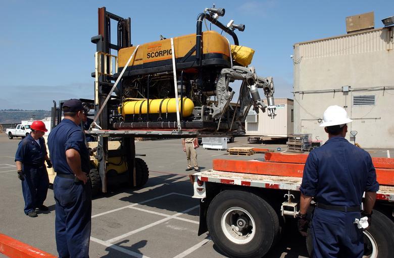 Keywords: US Navy 050805-N-4633P-002 Sailors assigned to the U.S. Navy's Tethered Underwater Vehicle System (TUWVS) Detachment, located at Naval Air Station North Island, make preparations to load Super Scorpio.jpg en San Diego Calif Aug 5 2005 - Sailors assigned to the U S Navy's Tethered Underwater Vehicle System TUWVS Detachment located at Naval Air Station North Island make preparations to load Super Scorpio a robotic rescue vehicle aboard an Air Force C-5 Galaxy aircraft The Navy is transporting two of the remotely operated vehicles in an effort to assist the rescue of seven Russian Sailors trapped on the ocean floor in a mini-submarine off the Kamchatka Peninsula The Super Scorpios and a team of U S Navy technicians are to be flown from San Diego to Petropavolvsk then transported by truck to be embarked on a Russian ship before making a descent to the stranded submarine U S Navy photo by Mr Geoffrey Patrick RELEASED 2005-08-05 050805-N-4633P-002 Navy http //www navy mil/view_image asp id 26900 U S Navy photo by Mr Geoffrey Patrick PD-USGov-Military-Navy Scorpio ROV at Naval Air Station North Island Military forklifts |