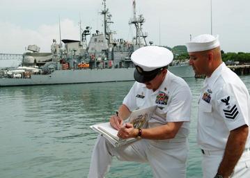 | Keywords: US Navy 050805-N-0962S-188 Master Chief Petty Officer of the Navy Terry Scott signs a charge-book for a chief petty officer selectee assigned to USS Devastator (MCM 6).jpg en Panama City Panama Aug 5 2005 - Master Chief Petty Officer of the Navy Terry Scott signs a charge-book for a chief petty officer selectee assigned to USS Devastator MCM 6 MCPON visited a variety of platforms operating in and around Panama to speak with Sailors about PANAMAX 2005 and the importance of joint interoperability with foreign navies PANAMAX is a training exercise in defense of the Panama Canal involving 15 countries U S Navy photo by Journalist 1st Class Brandan W Schulze RELEASED 2005-08-05 050805-N-0962S-188 Navy http //www navy mil/view_image asp id 27230 U S Navy photo by Journalist 1st Class Brandan W Schulze PD-USGov-Military-Navy USS Devastator MCM-6 PANAMAX 2005 Terry D Scott Naval Base Vasco Núñez de Balboa |