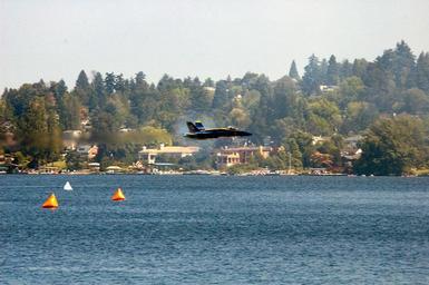 Keywords: US Navy 050806-N-3390M-019 The lead solo pilot assigned to the U.S. Navy flight demonstration team, the Blue Angels, conduct a high-speed, low level pass over Lake Washington.jpg en Seattle Aug 6 2005 The lead solo pilot assigned to the U S Navy flight demonstration team the Blue Angels conducts a high-speed low level pass over Lake Washington during Seattle Seafair events in Seattle Wash The Blue Angels fly the F/A-18A Hornet performing approximately 30 maneuvers during the aerial demonstration lasting over an hour Seafair is Seattle's month-long traditional summer festival which includes parades amateur athletics air shows and boat racing U S Navy photo by Photographer's Mate 3rd Class Douglas G Morrison RELEASED 2005-08-06 050806-N-3390M-019 Navy http //www navy mil/view_image asp id 26987 U S Navy photo by Photographer's Mate 3rd Class Douglas G Morrison PD-USGov-Military-Navy Blue Angels F/A-18 Hornets at Seafair 2005 Lake Washington Aircraft low altitude flight |