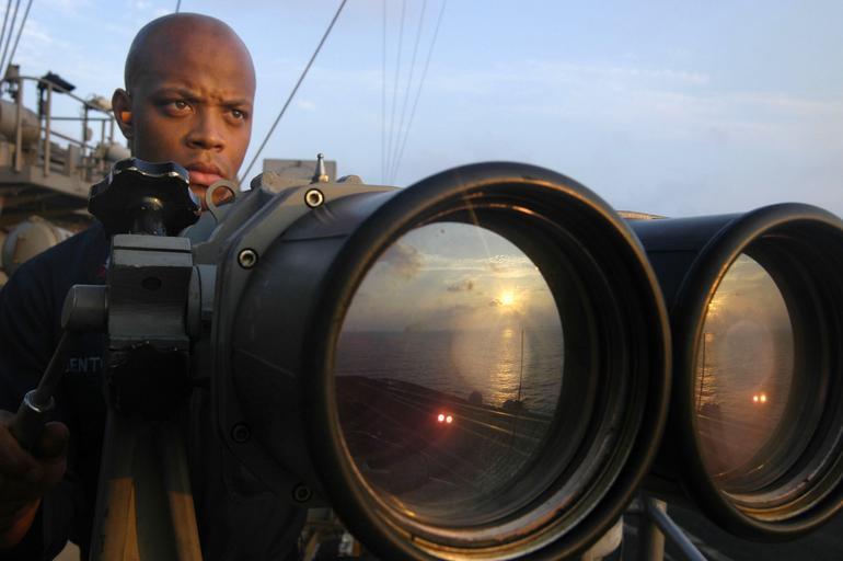 | Keywords: US Navy 050809-N-9389D-049 Culinary Specialist 1st Class Jermaine Benton watches aircraft launch through high-powered binoculars from the signal bridge.jpg  en Pacific Ocean Aug 9 2005 - Culinary Specialist 1st Class Jermaine Benton watches aircraft launch through high-powered binoculars from the signal bridge aboard the conventionally-powered aircraft carrier USS Kitty Hawk CV 63 The Kitty Hawk Carrier Strike Group is participating in the third annual Joint Air and Sea Exercise JASEX with the U S Air Force and U S Marine Corps in the Western Pacific JASEX focuses on integrated joint training proficiency in detecting locating tracking and engaging units at sea in the air and on land in response to a range of mission areas U S Navy photo by Photographer's Mate Airman Benjamin Dennis RELEASED 2005-08-09 050809-N-9389D-049 Navy http //www navy mil/view_image asp id 27063 U S Navy photo by Photographer's Mate Airman Benjamin Dennis PD-USGov-Military-Navy Culinary specialist United States Navy Aboard USS Kitty Hawk CV-63 People with binoculars Photographs by Benjamin Dennis |