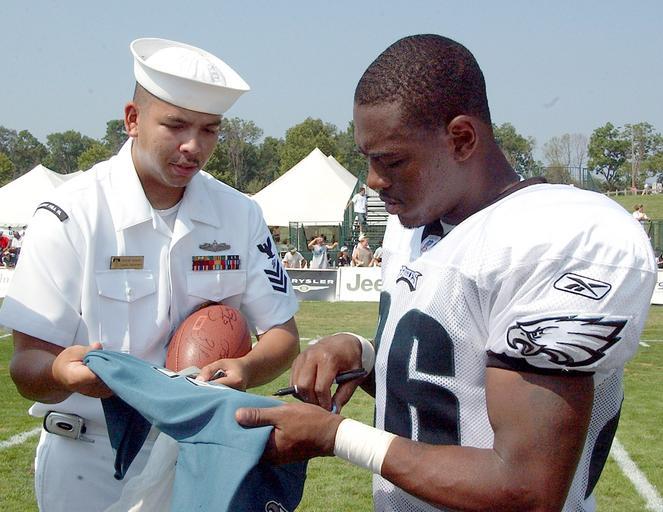 Keywords: US Navy 050811-N-4729H-171 Storekeeper 1st Class Washington Jaramillo assigned to Navy Recruiting District Philadelphia gets an autograph from Philadelphia Eagles cornerback Lito Sheppard.jpg en Lehigh Pa Aug 11 2005 - Storekeeper 1st Class Washington Jaramillo assigned to Navy Recruiting District Philadelphia gets an autograph from Philadelphia Eagles cornerback Lito Sheppard during the team's training camp The team sponsored a Military Appreciation Day for area military members featuring breakfast bleacher seats to watch practice and an autograph session after the morning session More than a hundred Sailors Marines Airmen and Soldiers from Pennsylvania and New Jersey bases were invited to participate U S Navy photo by Chief Journalist Monica Halman RELEASED 2005-08-11 050811-N-4729H-171 Navy http //www navy mil/view_image asp id 27213 U S Navy photo by Chief Journalist Monica Halman PD-USGov-Military-Navy Images from US Navy location Lehigh Pa Storekeeper Military Appreciation Day Lito Sheppard |