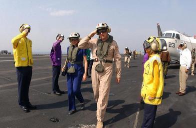 | Keywords: US Navy 050818-N-0413R-007 Chairman of the Joint Chiefs of Staff, U.S. Air Force Gen. Richard B. Myers and his wife, receive rainbow side boy honors as he arrives aboard the nuclear-powered aircraft carrier USS Nimitz (CVN 68).jpg en Persian Gulf Aug 18 2005 - Chairman of the Joint Chiefs of Staff U S Air Force Gen Richard B Myers and his wife receive rainbow side boy honors as he arrives aboard the nuclear-powered aircraft carrier USS Nimitz CVN 68 for a USO visit The Nimitz Strike Group is currently on a regularly scheduled deployment and is participating in Maritime Security Operations MSO MSO set the conditions for security and stability in the maritime environment as well as complement the counter-terrorism and security efforts of regional nations MSO deny international terrorists use of the maritime environment as a venue for attack or to transport personnel weapons or other material U S Navy photo by Photographer's Mate 3rd Class Shannon E Renfroe RELEASED 2005-08-18 050818-N-0413R-007 Navy http //www navy mil/view_image asp id 27288 U S Navy photo by Photographer's Mate 3rd Class Shannon E Renfroe PD-USGov-Military-Navy Aboard USS Nimitz CVN-68 |