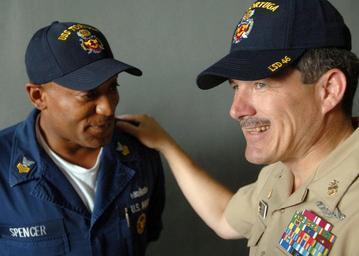 | Keywords: US Navy 050910-N-5345W-093 Master Chief Petty Officer of the Navy Terry Scott speaks with Navy Counselor 1st Class Ricardo Spencer shortly after coming aboard the dock landing ship USS Tortuga (LSD 46).jpg  en New Orleans Sept 10 2005 - Master Chief Petty Officer of the Navy Terry Scott speaks with Navy Counselor 1st Class Ricardo Spencer shortly after coming aboard the dock landing ship USS Tortuga LSD 46 Scott along with Chief of Naval Operations Adm Mike Mullen paid a visit to Tortuga to express their gratitude for the hard work and dedication shown by the crew during ongoing relief efforts while on station in the heart of New Orleans Tortuga is currently moored at Naval Support Activity New Orleans in support of Hurricane Katrina humanitarian assistance operations The Navy's involvement in the humanitarian assistance operations is being led by the Federal Emergency Management Agency FEMA in conjunction with the Department of Defense U S Navy photo by Photographer's Mate 3rd Class Kristopher Wilson RELEASED 2005-09-10 050910-N-5345W-093 Navy http //www navy mil/view_image asp id 28093 U S Navy photo by Photographer's Mate 3rd Class Kristopher Wilson PD-USGov-Military-Navy Naval Support Activity New Orleans Aboard USS Tortuga LSD-46 Navy Counselor Terry D Scott |