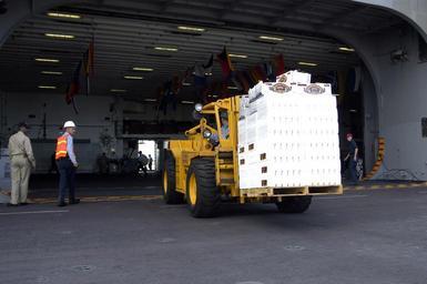 Keywords: US Navy 050920-N-1467R-017 Sailors assigned to the amphibious assault ship USS Bataan (LHD 5) move a pallet of supplies into the hangar bay.jpg en Mayport Fla Sept 20 2005 - Sailors assigned to the amphibious assault ship USS Bataan LHD 5 move a pallet of supplies into the hangar bay to be stored as part of the preparations the Bataan is taking after being diverted and put in standby in case any relief efforts are needed after Hurricane Rita U S Navy photo by Photographer s Mate Airman Pedro A Rodriguez RELEASED 2005-09-20 050920-N-1467R-017 Navy http //www navy mil/view_image asp id 28450 U S Navy photo by Photographer s Mate Airman Pedro A Rodriguez PD-USGov-Military-Navy Images from US Navy location Duval County Florida Aboard USS Bataan LHD-5 Military forklifts