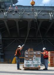 Keywords: US Navy 050920-N-9867P-005 Civilian contractors load pallets of food supplies onto the amphibious assault ship USS Bataan (LHD 5) while pierside in Mayport, Fla.jpg en Mayport Fla Sept 20 2005 - Civilian contractors load pallets of food supplies onto the amphibious assault ship USS Bataan LHD 5 while pierside in Mayport Fla Bataan is currently on board Naval Station Mayport taking-on food and stores in the event that the ship is needed for assistance in the wake of Hurricane Rita U S Navy photo by Photographer's Mate 2nd Class Scott Phillips RELEASED 2005-09-20 050920-N-9867P-005 Navy http //www navy mil/view_image asp id 28456 U S Navy photo by Photographer's Mate 2nd Class Scott Phillips PD-USGov-Military-Navy Naval Station Mayport Aboard USS Bataan LHD-5 |