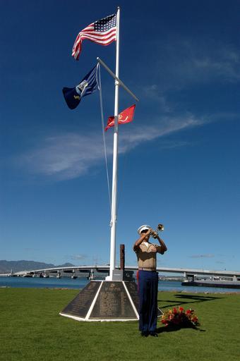 | Keywords: US Navy 051114-N-3019M-004 U.S. Marine Corps Sgt. Louis Magana echoes taps on his bugle during a ceremony dedicating a new flagstaff and display of bronze plaques.jpg en Pearl Harbor Hawaii Nov 14 2005 - U S Marine Corps Sgt Louis Magana echoes taps on his bugle during a ceremony dedicating a new flagstaff and display of bronze plaques commemorating 73 Marines who gave their lives and 15 survivors of the attack on the battleship USS Arizona at Pearl Harbor Dec 7 1941 The memorial features the names of the 88 Marines stationed aboard Arizona during the attack a piece of steam pipe from Arizona's original hull the National Ensign the U S Navy and U S Marine Corps flag U S Navy photo by Journalist 3rd Class Ryan C McGinley RELEASED 2005-11-14 051114-N-3019M-004 Navy http //www navy mil/view_image asp id 30039 U S Navy photo by Journalist 3rd Class Ryan C McGinley PD-USGov-Military-Navy 2005 in Pearl Harbor Taps bugle call |
