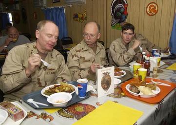 | Keywords: US Navy 051124-N-8055R-034 Commander Navy Reserve Forces celebrated Thanksgiving with Reserve Forces in Kuwait.jpg en Ali Al-Salem Kuwait Nov 24 2005 - Chief of Navy Reserve Commander Navy Reserve Force Vice Adm John G Cotton seated far left enjoys Thanksgiving Day celebrations with sailors from Naval Construction Battalion Twenty Two NMCB-22 and Navy Customs Battalion Papa at the U S Army s Life Support Area LSA Dining Facility DFAC in Kuwait Navy Customs Battalion PAPA is performing duties for the U S Army throughout Kuwait Iraq in support of Operation Iraqi Freedom U S Navy photo by Photographer s Mate 1st Class Lou Rosales RELEASED 2005-11-24 051124-N-8055R-034 Navy http //www navy mil/view_image asp id 30142 U S Navy photo by Photographer s Mate 1st Class Lou Rosales PD-USGov-Military-Navy Ali Al Salem Air Base John G Cotton |