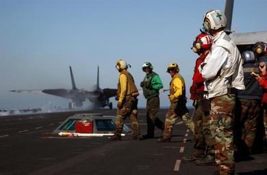 | Keywords: US Navy 051126-N-7241L-018 Flight deck personnel watch from the foul line as an F-14D Tomcat launches from the bow.jpg en Persian Gulf Nov 26 2005 - Flight deck personnel watch from the foul line as an F-14D Tomcat launches from the bow of the Nimitz-class aircraft carrier USS Theodore Roosevelt CVN 71 Roosevelt and embarked Carrier Air Wing Eight CVW-8 are currently underway on a regularly scheduled deployment conducting maritime security operations U S Navy photo by Photographer's Mate Airman Apprentice Nathan Laird RELEASED 2005-11-26 051126-N-7241L-018 Navy http //www navy mil/view_image asp id 30174 U S Navy photo by Photographer's Mate Airman Apprentice Nathan Laird PD-USGov-Military-Navy F-14D Tomcat on flight decks F-14 Tomcat aircraft carrier launches USS Theodore Roosevelt CVN-71 flight deck Photographs by Nathan Laird |