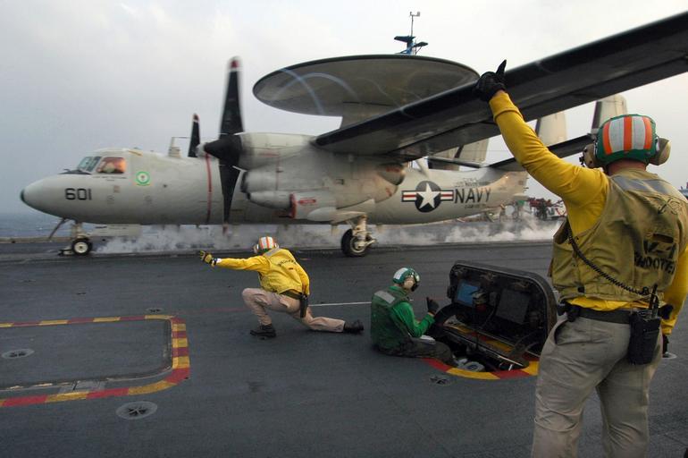 | Keywords: US Navy 051129-N-8604L-040 Catapult shooters signal to launch an E-2C Hawkeye.jpg en Pacific Ocean Nov 29 2005 Catapult shooters signal to launch an E-2C Hawkeye assigned to the Liberty Bells of Carrier Airborne Early Warning Squadron One One Five VAW-115 off the flight deck of the conventionally powered aircraft carrier USS Kitty Hawk CV 63 during cyclic flight operations Kitty Hawk and embarked Carrier Air Wing Five CVW-5 are currently conducting operations in the Western Pacific Ocean U S Navy photo by Photographer's Mate Airman Joshua Wayne LeGrand RELEASED 2005-11-29 051129-N-8604L-040 Navy http //www navy mil/view_image asp id 30318 U S Navy photo by Photographer's Mate Airman Joshua Wayne LeGrand PD-USGov-Military-Navy Aboard USS Kitty Hawk CV-63 Northrop Grumman E-2C Hawkeye aircraft carrier take-offs Airborne Early Warning Squadron 115 United States Navy |