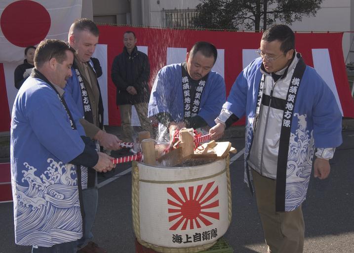 | Keywords: US Navy 051208-N-5686B-002 Command Master Chiefs William Holtz and Tuck WIlliams, along with Japan Maritime Self Defense Force (JMSDS) Chief Petty Officers Zense and Nakanish begin the Kagamiwari during the 19th Annual Mochi Po.jpg en Yokosuka Japan Dec 10 2005 - Commander Fleet Activities Yokosuka Command Master Chief William Holtz and Naval Information Operations Command Command Master Chief Tuck Williams along with Japan Maritime Self Defense Force JMSDS Chief Petty Officers Zense and Nakanish begin the Kagamiwari during the 19th Annual Mochi Pounding Festival held between the JMSDF and Yokosuka area U S Navy Chief Petty Officer Associations Kagamiwari is the ceremonial opening of the sake barrel U S Navy photo By Photographer's Mate 1st Class Crystal Brooks RELEASED 2005-12-10 051208-N-5686B-002 Navy http //www navy mil/view_image asp id 30609 U S Navy photo By Photographer's Mate 1st Class Crystal Brooks United States Fleet Activities Yokosuka Kagami biraki Sake PD-USGov-Military-Navy |