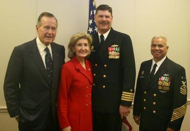 | Keywords: US Navy 060114-N-0191T-056 41st President George H.W. Bush at USS San Antonio commissioning.jpg  en Ingleside Texas Jan 14 2006 From left to right the 41st President of the United States the Honorable George H W Bush ship s sponsor for USS San Antonio LPD 17 Senator Kay Bailey Hutchison R-Tx pose with the ship s Commanding Officer Captain Jonathan M Padfield and Command Master Chief Willie De Santiago during a commissioning breakfast aboard ship As the first in her class USS San Antonio LPD 17 represents a key element of the Navy s seabase transformation Collectively San Antonio-class will functionally replace over 41 ships LPD 4 LSD 36 LKA 113 and LST 1179 classes of amphibious ships providing the Navy and Marine Corps with modern seabased platforms that are networked survivable and built to operate with 21st century transformational platforms such as the MV-22 Osprey the Expeditionary Fighting Vehicle EFV and future means by which Marines are delivered ashore U S Navy photo by Journalist 2nd Class Anthony C Tornetta RELEASED 2006-01-14 060114-N-0191T-056 Navy http //www navy mil/view_image asp id 31230 U S Navy photo by Journalist 2nd Class Anthony C Tornetta PD-USGov-Military-Navy Commissioning of USS San Antonio LPD-17 George H W Bush |