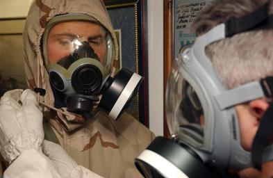 | Keywords: US Navy 060116-N-0212M-001 Hull Technician 3rd Class Steven Colburn, stationed aboard the amphibious-assault ship USS Boxer (LHD 4) has his Chemical, Biological and Radiological (CBR) suit adjusted during a general quarters dri.jpg  en Pacific Ocean Jan 16 2006 Hull Technician 3rd Class Steven Colburn stationed aboard the amphibious-assault ship USS Boxer LHD 4 has his Chemical Biological and Radiological CBR suit adjusted during a general quarters drill GQ Boxer is currently operating off of the California coast conducting shipboard training and flight deck qualifications U S Navy photo by Journalist 1st Class Michael Miller RELEASED 2006-01-16 060116-N-0212M-001 Navy http //www navy mil/view_image asp id 31906 U S Navy photo by Journalist 1st Class Michael Miller PD-USGov-Military-Navy Aboard USS Boxer LHD-4 Military protective clothing Males wearing gas masks MCU-2/P Protective Mask |