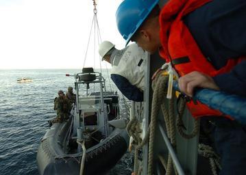 | Keywords: US Navy 060117-N-7027P-030 Personnel assigned to U.S. Naval Special Clearance Team One (NSCT-1) hold onto to their eleven-meter rigid hull inflatable boat.jpg en Pacific Ocean Jan 17 2006 - Personnel assigned to U S Naval Special Clearance Team One NSCT-1 hold onto to their eleven-meter rigid hull inflatable boat RHIB as it is lifted aboard amphibious dock landing ship USS Comstock LSD 45 NSCT-1 is currently conducting mine counter measure training operations U S Navy photo by Photographer's Mate 2nd Class Sandra M Palumbo RELEASED 2006-01-17 060117-N-7027P-030 Navy http //www navy mil/view_image asp id 31599 U S Navy photo by Photographer's Mate 2nd Class Sandra M Palumbo PD-USGov-Military-Navy Aboard USS Comstock LSD-45 United States Naval Special Clearance Team One |