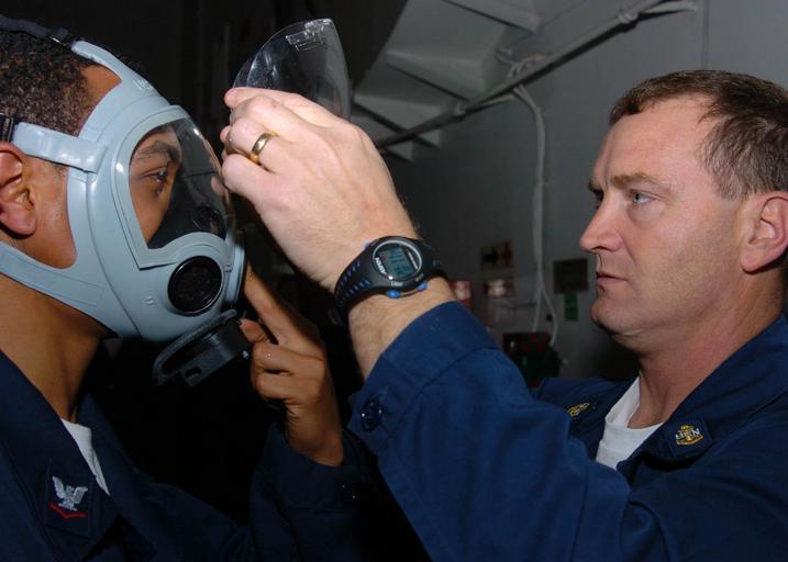 | Keywords: US Navy 060127-N-9641C-002 Chief Damage Controlman, John Brooks, removes the face shield from a Sailor^rsquo,s MCU-2-P gas mask.jpg  en Atlantic Ocean Jan 27 2006 - Chief Damage Controlman John Brooks removes the face shield from a Sailor s MCU-2/P gas mask after washing it with decontamination solution during a General Quarters Drill aboard the Nimitz class aircraft carrier USS Dwight D Eisenhower CVN 69 Eisenhower is underway conducting carrier qualifications U S Navy photo by Airman Peter Carnicelli RELEASED 2006-01-27 060127-N-9641C-002 Navy http //www navy mil/view_image asp id 31569 U S Navy photo by Airman Peter Carnicelli PD-USGov-Military-Navy Damage Controlman Aboard USS Dwight D Eisenhower CVN-69 MCU-2/P Protective Mask Males wearing gas masks |