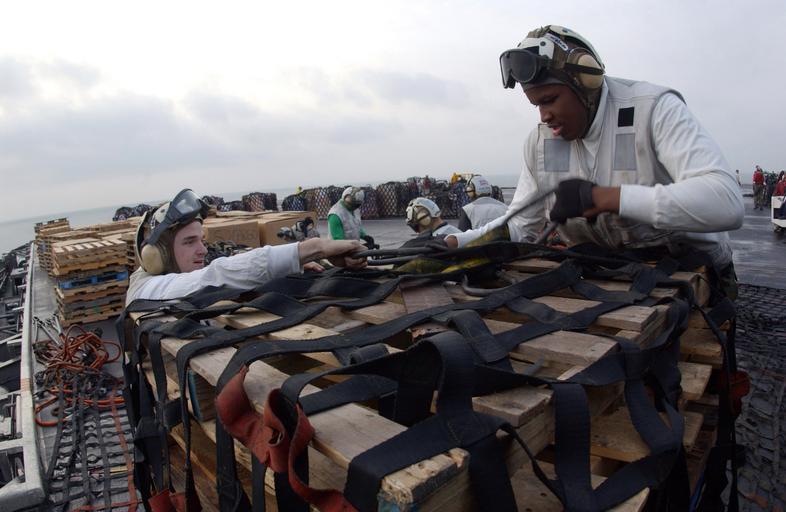 | Keywords: US Navy 060205-N-0685C-002 Sailors stationed aboard the Nimitz-class aircraft carrier USS Theodore Roosevelt (CVN 71) secure cargo to be transported.jpg  en Persian Gulf Feb 5 2006 Sailors stationed aboard the Nimitz-class aircraft carrier USS Theodore Roosevelt CVN 71 secure cargo to be transported during a Vertical Replenishment VERTREP with Military Sealift Command MSC combat stores ship USNS Spica T-AFS 9 Roosevelt and embarked Carrier Air Wing Eight CVW-8 are currently underway on a regularly scheduled deployment conducting maritime security operations U S Navy photo by Photographer's Mate Airman Javier Capella RELEASED 2006-02-05 060205-N-0685C-002 Navy http //www navy mil/view_image asp id 31808 U S Navy photo by Photographer's Mate Airman Javier Capella PD-USGov-Military-Navy USS Theodore Roosevelt CVN-71 flight deck Vertical replenishment |
