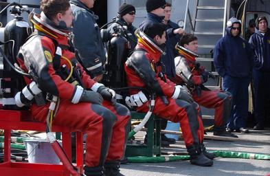 Keywords: US Navy 060329-F-3759D-001 U.S. Navy divers assigned to the rescue and salvage ship USS Safeguard (ARS 50) prepare to dive.jpg en Yellow Sea March 29 2006 - U S Navy divers assigned to the rescue and salvage ship USS Safeguard ARS 50 prepare to dive near the wreckage of a U S Air Force F-16C lost at sea on March 14th Safeguard crews and the Republic of Korea Navy ship ROKS Pyong Taek ATS 27 took on the real-world salvage effort off the coast of Kunsan Air Base as part of salvage exercise SALVEX 06 U S Air Force photo by Senior Airman Joshua L DeMotts RELEASED 2006-03-29 060329-F-3759D-001 Navy http //www navy mil/view_image asp id 33326 U S Navy photo PD-USGov-Military-Navy Aboard USNS Safeguard T-ARS-50 Dry suits |
