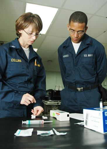 Keywords: US Navy 060509-N-1577S-081 Lt. Tara Collins of Crestwood, Ky., teaches Hospitalman Vicente Mendez of Brooklyn, N.Y., proper procedures on testing a patient's blood during a skills-a-thon.jpg en Pacific Ocean May 9 2006 - Lt Tara Collins of Crestwood Ky teaches Hospitalman Vicente Mendez of Brooklyn N Y proper procedures on testing a patient's blood during a skills-a-thon aboard Military Sealift Command MSC hospital ship USNS Mercy T-AH 19 The skills a thon was held to test the skills that would be required in a typical hospital setting Mercy is on a five-month deployment during which it will visit areas of South Asia Southeast Asia and the Pacific Islands where its crew and several health and civic-related organizations will work together to aid in humanitarian assistance and civic efforts Mercy is uniquely capable of supporting medical and humanitarian assistance needs and is configured with special medical equipment and a robust multi-specialized medical team to provide a range of services ashore as well as aboard the ship The medical staff is augmented with an assistance crew many of whom are part of non-governmental organizations which have significant medical capabilities U S Navy photo by Photographer's Mate 3rd Class Timothy F Sosa RELEASED 2006-05-09 060509-N-1577S-081 Navy http //www navy mil/view_image asp id 34352 U S Navy photo by Photographer's Mate 3rd Class Timothy F Sosa PD-USGov-Military-Navy Aboard USNS Mercy T-AH-19 |
