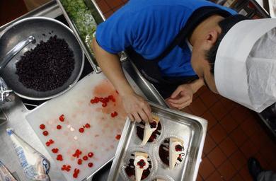 Keywords: US Navy 060510-N-5549O-080 Culinary Specialist 2nd Class Jerwin Mejia, adds the final toppings onto slices of cheese cake that will be served to the mothers stationed aboard.jpg en Persian Gulf May 10 2006 - Culinary Specialist 2nd Class Jerwin Mejia adds the final toppings onto slices of cheese cake that will be served to the mothers stationed aboard the Nimitz-class aircraft carrier USS Ronald Reagan CVN 76 during a special Mother's Day lunch Reagan and embarked Carrier Air Wing One Four CVW-14 are currently deployed as part of a routine rotation of U S maritime forces in support of the global war on terrorism U S Navy photo by Photographer's Mate 3rd Class Kevin O'Brien RELEASED 2006-05-10 060510-N-5549O-080 Navy http //www navy mil/view_image asp id 34384 U S Navy photo by Photographer's Mate 3rd Class Kevin O'Brien PD-USGov-Military-Navy Cake decorating Plating up Culinary specialist United States Navy Food preparation aboard USS Ronald Reagan CVN-76 Mother's Day cakes |