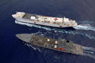 Keywords: US Navy 060516-N-6501M-031 USNS Mercy performs an underway replenishment operation with USNS Pecos.jpg en Pacific Ocean May 16 2006 - The Military Sealift Command MSC hospital ship USNS Mercy T-AH 19 performs an underway replenishment operation with MSC replenishment oiler USNS Pecos T-AO 197 Mercy is conducting a five-month humanitarian deployment to South and Southeast Asia and the Pacific Islands The medical crew aboard Mercy will provide general and ophthalmology surgery basic medical evaluation and treatment preventive medicine treatment dental screenings and treatment optometry screenings eyewear distribution public health training and veterinary services as requested by the host nations Mercy is uniquely capable of supporting medical and humanitarian assistance needs and is configured with special medical equipment and a robust multi-specialized medical team who can provide a range of services ashore as well as aboard the ship The medical staff is augmented with an assistance crew many of whom are part of non-governmental organizations that have significant medical capabilities U S Navy photo by Chief Photographer's Mate Edward G Martens RELEASED 2006-05-16 060516-N-6501M-031 Navy http //www navy mil/view_image asp id 34595 U S Navy photo by Chief Photographer's Mate Edward G Martens PD-USGov-Military-Navy Plan views underway replenishment |