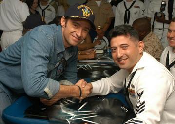 Keywords: US Navy 060524-N-1371G-175 U.S. Navy Fleet Week New York 2006.jpg en New York Harbor May 24 2006 - Aboard the amphibious assault ship USS Kearsarge LHD 3 actor Hugh Jackman shakes hands with Damage Controlman 1st Class Alex Lopez of Chicago Ill during an autograph signing session Jackman who plays Logan AKA Wolverine in the 20th Century Fox upcoming action sci-fi X-Men The Last Stand visited with Sailors and embarked Marines during the opening day of Fleet Week New York 2006 The crew was also given a special sneak preview of the film before its worldwide release date of May 26 2006 Fleet Week has been sponsored by New York City since 1984 in celebration of the United States sea service The annual event also provides an opportunity for citizens of New York City and the surrounding Tri-State area to meet Sailors and Marines as well as witness first hand the latest capabilities of today's Navy and Marine Corps team Fleet week includes dozens of military demonstrations and displays including public tours of many of the participating ships U S Navy photo by Photographer's Mate 2nd Class Valerie S Guffey RELEASED 2006-05-24 060524-N-1371G-175 Navy http //www navy mil/view_image asp id 34868 U S Navy photo by Photographer's Mate 2nd Class Valerie S Guffey PD-USGov-Military-Navy Hugh Jackman on the USS Kearsarge LHD-3 |