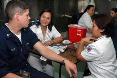 Keywords: US Navy 060531-N-3931M-012 Nurses for the Philippine National Red Cross, takes a temperature reading and other vital information from Navy Petty Officer 3rd Class Christopher Orr.jpg en Zamboanga Philippines May 31 2006 - Nurses for the Philippine National Red Cross takes a temperature reading and other vital information from Navy Petty Officer 3rd Class Christopher Orr from San Diego Calif during a Red Cross blood drive aboard the U S Military Sealift Command MSC hospital ship USNS Mercy T-AH 19 while visiting the city on a scheduled humanitarian visit Admitted as a member of the League of Red Cross and Red Crescent Federation on Sept 17 1947 the Philippine National Red Cross aids the government to provide relief assistance to victims in need Mercy is on a five-month deployment to South Asia Southeast Asia and the Pacific Islands The medical crew aboard Mercy will provide general and ophthalmology surgery basic medical evaluation and treatment preventive medicine treatment dental screenings and treatment optometry screenings eyewear distribution public health training and veterinary services as requested by the host nations Like all U S Naval forces Mercy is able to rapidly respond to a range of situations on short notice Mercy is uniquely capable of supporting medical and humanitarian assistance needs and is configured with special medical equipment and a robust multi-specialized medical team who can provide a range of services ashore as well as aboard the ship The medical staff is augmented with an assistance crew many of whom are part of non-governmental organizations which have significant medical capabilities U S Navy photo by Photographer's Mate 1st Class Michael R McCormick RELEASED 2006-05-31 060531-N-3931M-012 Navy http //www navy mil/view_image asp id 35314 U S Navy photo by Photographer's Mate 1st Class Michael R McCormick PD-USGov-Military-Navy United States Navy in Zamboanga City Aboard USNS Mercy T-AH-19 |
