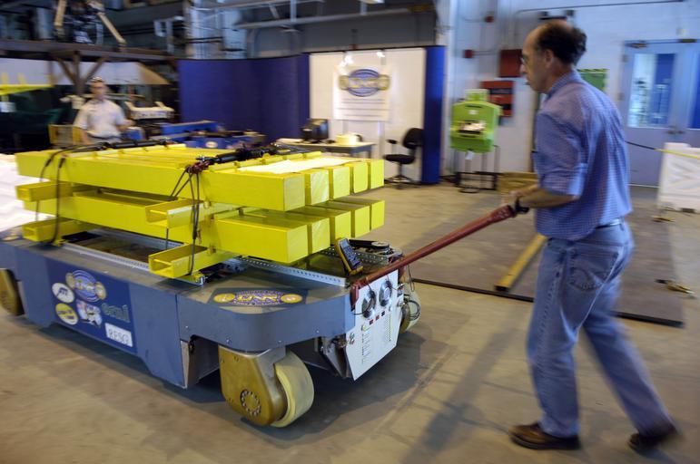 Keywords: US Navy 060601-N-7676W-054 John Jansen from the Oak Ridge National Laboratory (ORNL) demonstrates the Office of Naval Research (ONR) sponsored Compact Agile Material Mover (CAMM) to Navy leaders from the CVN-21 Aircraft Carrier.jpg en Oak Ridge Tenn June 1 2006 - John Jansen from the Oak Ridge National Laboratory ORNL demonstrates the Office of Naval Research ONR sponsored Compact Agile Material Mover CAMM to Navy leaders from the CVN-21 Aircraft Carriers Naval Air Forces and other Naval Sea Systems Commands The CAMM along with Human Amplification Technology HAT effort enables one person to move very heavy cargo items up to 10 000 pounds with nearly pinpoint accuracy The key technology is the Off-Center In-Line Omni-directional Wheel OCILOW and its associated electrically powered drive train capable of moving heavy payloads in confined spaces on uneven surfaces and in varying shipboard sea-induced motions U S Navy Photo by Mr John F Williams RELEASED 2006-06-01 060601-N-7676W-054 Navy http //www navy mil/view_image asp id 35348 U S Navy Photo by Mr John F Williams PD-USGov-Military-Navy Images from US Navy location Oak Ridge Tenn |