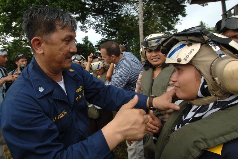 | Keywords: US Navy 060603-N-6501M-044 U.S. Navy Cmdr. Henry Villareal, Executive Officer of the U.S. Military Sealift Command (MSC) hospital ship USNS Mercy (T-AH 19), assists a Filipino woman with her flotation gear.jpg en Jolo Philippines June 03 2006 - U S Navy Cmdr Henry Villareal Executive Officer of the U S Military Sealift Command MSC hospital ship USNS Mercy T-AH 19 assists a Filipino woman with her flotation gear as she prepares for her flight with other patients from the Sulu Provincial Hospital on an MH-60 Knighthawk to the hospital ship for medical treatment During the ship's one-week stay off the coast of Jolo patients are shuttled to and from the ship by the Island Knights of Guam-based Helicopter Sea Combat Squadron Two Five HSC-25 Mercy's medical staff will provide a multitude of medical dental and veterinary care for the people who live in this region together with their Filipino counterparts both at local city medical centers and on the ship itself Mercy's stop in Jolo is one of many during its humanitarian deployment to South and Southeast Asia and the Pacific Islands Mercy is able to rapidly respond to a range of situations on short notice and is capable of supporting medical and humanitarian assistance needs with special medical equipment and a multi-specialized medical team providing a range of services ashore as well as aboard the ship The medical staff is augmented with an assistance crew many of whom are part of non-governmental organizations that have significant medical capabilities U S Navy photo by Chief Photographer's Mate Edward G Martens RELEASED 2006-06-03 060603-N-6501M-044 Navy http //www navy mil/view_image asp id 35528 U S Navy photo by Chief Photographer's Mate Edward G Martens PD-USGov-Military-Navy Images from US Navy location Jolo Philippines Aboard USNS Mercy T-AH-19 Helicopter Sea Combat Squadron 25 United States Navy |