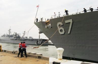 | Keywords: US Navy 060608-N-2736O-002 Sailors assigned to the guided-missile destroyer USS Cole (DDG 67) man the rails as line handlers cast off the ship's lines.jpg en Norfolk Va June 8 2006 - Sailors assigned to the guided-missile destroyer USS Cole DDG 67 man the rails as line handlers cast off the ship's lines Cole will deploy as part of the Iwo Jima Expeditionary Strike Group ESG The ESG consists of the amphibious assault ship USS Iwo Jima LHD 7 the amphibious transport ship USS Nashville LPD 13 the guided missile destroyers USS Cole DDG 67 and USS Bulkeley DDG 84 - all home ported in Norfolk Va ; the guided missile cruiser USS Philippine Sea CG 58 - homeported at Naval Station Mayport Fla ; the attack submarine USS Albuquerque SSN 706 - home ported at Naval Station Groton Conn ; and the dock landing ship USS Whidbey Island LSD 41 - home ported in Naval Amphibious Base Little Creek Va The 24th Marine Expeditionary Unit MEU is comprised of its command element 1st Battalion 8th Marines; Marine Medium Helicopter Squadron 365 and the MEU Service Support Group 24 all homeported at Camp Lejeune N C The Iwo Jima ESG has deployed for six months to conduct maritime security operations in support of the Global War on Terrorism U S Navy Photo By Journalist Seaman Charles A Ordoqui RELEASED 2006-06-08 060608-N-2736O-002 Navy http //www navy mil/view_image asp id 35557 U S Navy Photo By Journalist Seaman Charles A Ordoqui PD-USGov-Military-Navy Naval Station Norfolk Aboard USS Whidbey Island LSD-41 Manning the rail in the United States Navy Mooring bollards |