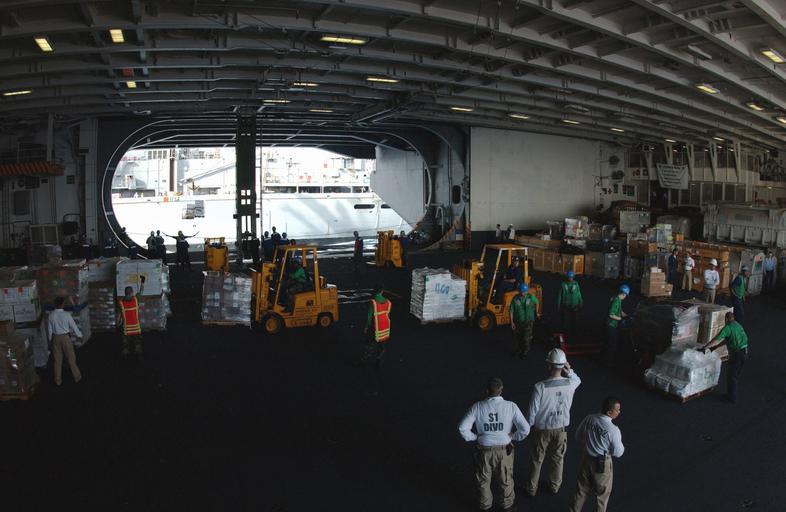 | Keywords: US Navy 060615-N-7526R-072 Deck and Supply Department personnel work to move cargo in the hangar bay of the Nimitz-class aircraft carrier USS Ronald Reagan (CVN 76) during an underway replenishment (UNREP) with the fast combat.jpg  en Philippine Sea June 15 2006 - Deck and Supply Department personnel work to move cargo in the hangar bay of the Nimitz-class aircraft carrier USS Ronald Reagan CVN 76 during an underway replenishment UNREP with the fast combat support ship USNS Rainier T-AOE 7 Reagan and embarked Carrier Air Wing One Four CVW-14 are currently on a regularly scheduled deployment in support of the global war on terrorism as well as conducting Maritime Security Operations U S Navy photo by Journalist 3rd Class Marc Rockwell-Pate RELEASED 2006-06-15 060615-N-7526R-072 Navy http //www navy mil/view_image asp id 35840 U S Navy photo by Journalist 3rd Class Marc Rockwell-Pate PD-USGov-Military-Navy Underway replenishment Hangar bays of USS Ronald Reagan CVN-76  |