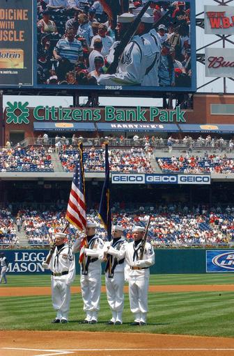 | Keywords: US Navy 060618-N-4729H-120 Navy Recruiting District Philadelphia Color Guard members present the American flag on the Citizens Bank Park infield.jpg en Philadelphia June 18 2006 - Navy Recruiting District Philadelphia Color Guard members present the American flag on the Citizens Bank Park infield and were displayed for the crowd on the scoreboard during the Philadelphia Phillies' Father's Day game The color guard was part of a special tribute along with the Navy Parachute Team Leapfrogs Several of Leapfrogs team members delivered game balls to the team one of which was used as the first pitch thrown by Supreme Court Justice Samuel Alito The Leapfrogs were in town performing on board Naval Air Station Joint Reserve Base Willow Grove Air Show over the weekend U S Navy photo by Chief Journalist Monica Hallman RELEASED 2006-06-18 060618-N-4729H-120 Navy http //www navy mil/view_image asp id 36030 U S Navy photo by Chief Journalist Monica Hallman PD-USGov-Military-Navy Images from US Navy location Philadelphia PA |