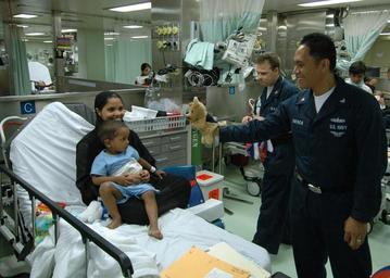 Keywords: US Navy 060701-N-3532C-032 Navy Hospital Corpsman 3rd Class Ronald Bayaca of San Diego, Calif., entertains a young patient aboard the U.S. Military Sealift Command hospital ship USNS Mercy (T-AH 19).jpg en Chittagong Bangladesh July 1 2006 - Navy Hospital Corpsman 3rd Class Ronald Bayaca of San Diego Calif entertains a young patient aboard the U S Military Sealift Command hospital ship USNS Mercy T-AH 19 The child is aboard Mercy preparing to undergo cleft lip surgery during Mercy's visit to provide humanitarian and civic assistance to the people of Bangladesh For the next several days Mercy's medical crew will work together with Operation Smile to conduct cleft lip and palate surgeries Mercy is on a five-month deployment to South Asia Southeast Asia and the Pacific Islands having recently completed 24 days of humanitarian assistance to the people of the southern Philippines The medical crew aboard Mercy will provide general and ophthalmology surgery basic medical evaluation and treatment preventive medicine treatment dental screenings and treatment optometry screenings eyewear distribution public health training and veterinary services as requested by the host nations Mercy is uniquely capable of supporting medical and humanitarian assistance needs and is configured with special medical equipment and a robust multi-specialized medical team that can provide a range of services ashore as well as aboard the ship The medical staff is augmented with an assistance crew many of whom are part of nongovernmental organizations that have significant medical capabilities U S Navy photo by Mass Communication Specialist Seaman Joseph Caballero RELEASED 2006-07-01 060701-N-3532C-032 Navy http //www navy mil/view_image asp id 36337 U S Navy photo PD-USGov-Military-Navy Images from US Navy location Chittagong Bangladesh |