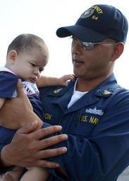 Keywords: US Navy 060908-N-8544C-042 Senior Chief Hospital Corpsman Torsak Vimoktayon holds his six-month old son upon his return to Mayport.jpg en Mayport Fla Sept 8 2006 - Senior Chief Hospital Corpsman Torsak Vimoktayon holds his six-month old son upon his return to Mayport Vimoktayon is stationed aboard the guided-missile destroyer USS Carney DDG 64 which is returning after participating in exercises during the UNITAS Pacific Phase exercise UNITAS is an annual exercise in the South American region This year's Pacific phase hosted by Chile includes navies from seven countries including Chile Colombia Ecuador Mexico Peru Spain and the United States The exercise is designed to train each Navy in a variety of maritime scenarios with each operating as a component of the multinational force U S Navy photo by Mass Communication Specialist 2nd Class Susan Cornell RELEASED 2006-09-08 060908-N-8544C-042 Navy http //www navy mil/view_image asp id 39005 U S Navy photo by Mass Communication Specialist 2nd Class Susan Cornell PD-USGov-Military-Navy USS Carney DDG-64 Hospital Corpsman |