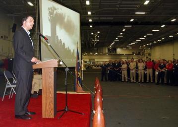 Keywords: US Navy 060911-N-0490C-007 Lt. Kevin Shaeffer (Ret.), speaks to the crew aboard the Nimitz-class aircraft carrier USS Dwight D. Eisenhower (CVN 69) during a Patriot Day remembrance ceremony.jpg en Atlantic Ocean Sept 11 2006 - Lt Kevin Shaeffer Ret speaks to the crew aboard the Nimitz-class aircraft carrier USS Dwight D Eisenhower CVN 69 during a Patriot Day remembrance ceremony five years following the terrorist attacks on New York the Pentagon and Shanksville Pa Shaeffer was the sole survivor in the Navy s Command Center which was the point of impact when Flight 77 crashed into the Pentagon killing 29 of his command center shipmates Shaeffer recounted his experiences that day and his challenging recovery months following One hundred eighty-four lives were lost in the Pentagon attack that day He thanked Eisenhower's crew for their service and contributions in the global war on terrorism U S Navy photo by Mass Communication Specialist 2nd Class Miguel Angel Contreras RELEASED 2006-09-11 060911-N-0490C-007 Navy http //www navy mil/view_image asp id 39055 U S Navy photo by Mass Communication Specialist 2nd Class Miguel Angel Contreras PD-USGov-Military-Navy Aboard USS Dwight D Eisenhower CVN-69 Fifth anniversary of the September 11 2001 attacks |