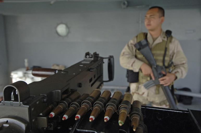 Keywords: US Navy 061116-N-8148A-045 Master-at-Arms 2nd Class Jeff Phan, attached to Mobile Security Squadron Three (MSS-3), stands a fixed post watch behind a .50-caliber machine gun, while conducting his security watch.jpg en Jebel Ali United Arab Emirates Nov 16 2006 - Master-at-Arms 2nd Class Jeff Phan attached to Mobile Security Squadron Three MSS-3 stands a fixed post watch behind a 50-caliber machine gun while conducting his security watch MSS-3 squadron personnel are currently on board USNS Supply T-AOE 6 providing force protection in support of Maritime Security Operations MSO MSO help set the conditions for security and stability in the maritime environment as well as complement the counter-terrorism and security efforts of regional nations U S Navy photo by Mass Communication Specialist 2nd Class Kitt Amaritnant RELEASED 2006-11-16 061116-N-8148A-045 Navy http //www navy mil/view_image asp id 40982 U S Navy photo by Mass Communication Specialist 2nd Class Kitt Amaritnant PD-USGov-Military-Navy Images from US Navy location Jebel Ali United Arab Emirates Browning M2 of the US Navy Males with M16 rifle Master-at-arms United States Navy Mobile Security Squadron 3 People with ammunition belts 50 BMG Aboard USNS Supply T-AOE-6 |