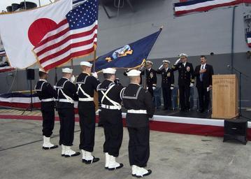 | Keywords: US Navy 061212-N-2716P-004 The honor guard assigned to USS Stethem (DDG 63) parades the colors during the change of command ceremony held onboard Naval base Yokosuka.jpg en Yokosuka Japan Dec 12 2006 The honor guard assigned to USS Stethem DDG 63 parades the colors during the change of command ceremony held onboard Naval base Yokosuka Cmdr Paul J Lyons relieved Cmdr Robert P Gonzales as commanding officer of Stethem U S Navy photo by Mass Communication Specialist 1st Class Paul J Phelps RELEASED 2006-12-12 061212-N-2716P-004 Navy http //www navy mil/view_image asp id 41526 U S Navy photo by Mass Communication Specialist 1st Class Paul J Phelps PD-USGov-Military-Navy United States Fleet Activities Yokosuka Aboard USS Stethem DDG-63 Change of command |