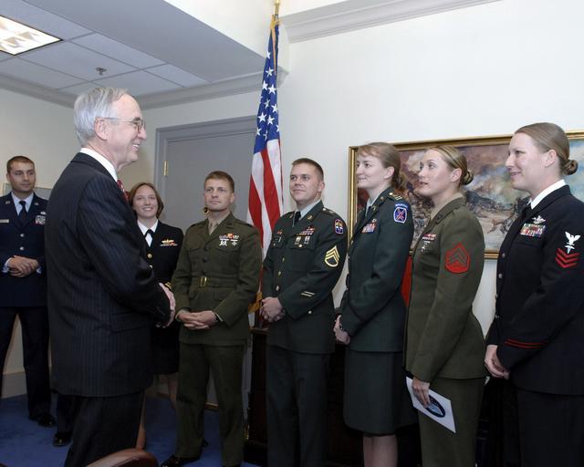 Keywords: US Navy 070330-D-2987S-070 Deputy Secretary of Defense Gordon England meets with.jpg en WASHINGTON D C March 30 2007 - Deputy Secretary of Defense Gordon England meets with Why We Serve military speakers at the Pentagon prior to their 90-day tour Why We Serve is an outreach program designed to assist communities in locating uniformed members of the Armed Forces to speak about the nobility of service and share their personal experiences with the American people Community organizations business associations academic institutions veterans groups and other non-profit or non-partisan organizations requesting a speaker from Why We Serve can look forward to hearing from a service member who has recently returned from Afghanistan Iraq or the Horn of Africa DoD photo by Helene C Stikkel RELEASED 2007-03-30 070330-D-2987S-070 Navy http //www navy mil/view_image asp id 44763 U S Navy photo PD-USGov-Military-Navy People of the United States Navy Gordon R England |