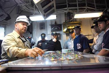 Keywords: US Navy 070501-N-3659B-136 Senior Chief Aviation Boatswain^rsquo,s Mate Timothy Goode explains flight deck operations aboard USS Ronald Reagan (CVN 76) to representatives the Washington Nationals baseball team.jpg en CORONADO Calif May 1 2007 - Senior Chief Aviation Boatswain s Mate Timothy Goode explains flight deck operations aboard USS Ronald Reagan CVN 76 to representatives the Washington Nationals baseball team The Nationals toured Ronald Reagan participated in an autograph session and had lunch with Sailors Ronald Reagan is currently undergoing Planned Incremental Availability in her homeport of San Diego U S Navy photo by Mass Communication Specialist 2nd Class Joseph M Buliavac RELEASED 2007-05-01 070501-N-3659B-136 Navy http //www navy mil/view_image asp id 45661 U S Navy photo by Mass Communication Specialist 2nd Class Joseph M Buliavac PD-USGov-Military-Navy Flight deck control of USS Ronald Reagan CVN-76 Washington Nationals players Ouija boards aircraft carrier Guests aboard USS Ronald Reagan CVN-76 2007 Washington Nationals season |
