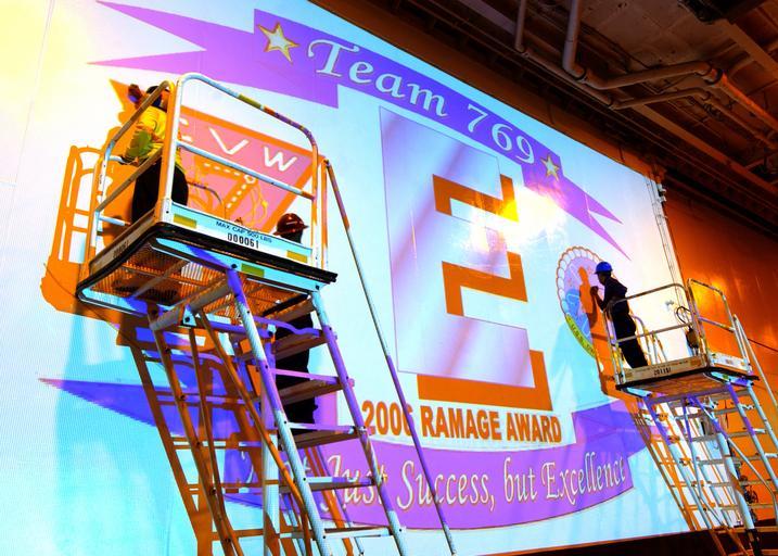 | Keywords: US Navy 070504-N-6854D-003 Sailors paint a Battle E and Ramage award emblem on the hangar bay doors of Nimitz-class aircraft carrier USS Dwight D. Eisenhower (CVN 69).jpg USS Dwight D Eisenhower CVN 69 Eisenhower and embarked Carrier Air Wing CVW 7 are on a regularly scheduled deployment in support of Maritime Security Operations MSO U S Navy photo by Mass Communication Specialist Seaman Apprentice Jon Dasbach RELEASED 2007-05-04 070504-N-6854D-003 Navy http //www navy mil/view_image asp id 45809 U S Navy photo by Mass Communication Specialist Seaman Apprentice Jon Dasbach PD-USGov-Military-Navy Aboard USS Dwight D Eisenhower CVN-69 Battle E Award |