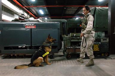 Keywords: US Navy 070507-N-9818V-071 Master-at-Arms 3rd Class Lisette Latorre, attached to Naval Security Force, K-9 Unit, trains with her military working dog Anna, a four-year-old German shepard.jpg en BAHRAIN May 7 2007 - Master-at-Arms 3rd Class Lisette Latorre attached to Naval Security Force K-9 Unit trains with her military working dog Anna a four-year-old German shepard in a detection proficient trail and training exercise which Anna successfully met her objective of finding the explosive The training is held at least three times per month so the dogs stay adept in detecting explosive odors U S Navy photo by Mass Communication Specialist 2nd Class Jennifer A Villalovos RELEASED 2007-05-07 070507-N-9818V-071 Navy http //www navy mil/view_image asp id 45927 U S Navy photo by Mass Communication Specialist 2nd Class Jennifer A Villalovos PD-USGov-Military-Navy German Shepherd Dog Master-at-arms Military working dogs of the United States United States Navy images from Bahrain |