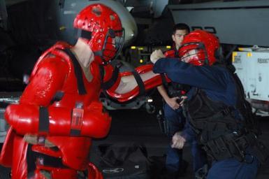 | Keywords: US Navy 070620-N-7883G-016 Sailors practice baton striking skills using a.jpg  en CORAL SEA June 20 2007 - Sailors practice baton striking skills using a red man training gear aboard USS Kitty Hawk CV 63 Twelve Kitty Hawk Sailors are undergoing a three-week training course to become members of the ship's force protection team Kitty Hawk Carrier Strike Group is participating in exercise Talisman Saber 2007 in the Coral Sea near the coast of Australia U S Navy photo by Mass Communication Specialist Seaman Kyle D Gahlau RELEASED 2007-06-20 070620-N-7883G-016 Navy http //www navy mil/view_image asp id 47365 U S Navy photo by Mass Communication Specialist Seaman Kyle D Gahlau PD-USGov-Military-Navy Aboard USS Kitty Hawk CV-63 Talisman Sabre 2007 |
