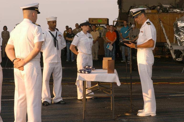 | Keywords: US Navy 070707-N-3080T-001 Lt. John Van Dyke reads a passage from the Bible while conducting a burial at sea for retired Chief Boiler Technician John Freeman and retired Cmdr. James Gilbert aboard Nimitz-class aircraft carrier.jpg en ATLANTIC OCEAN July 7 2007 Lt John Van Dyke reads a passage from the Bible while conducting a burial at sea for retired Chief Boiler Technician John Freeman and retired Cmdr James Gilbert aboard Nimitz-class aircraft carrier USS Dwight D Eisenhower CVN 69 Eisenhower is underway conducting carrier qualifications U S Navy photo by Mass Communication Specialist Seaman Laura Thuman RELEASED 2007-07-07 070707-N-3080T-001 Navy http //www navy mil/view_image asp id 48067 U S Navy photo by Mass Communication Specialist Seaman Laura Thuman PD-USGov-Military-Navy Sea burials Flight deck of USS Dwight D Eisenhower CVN-69 |