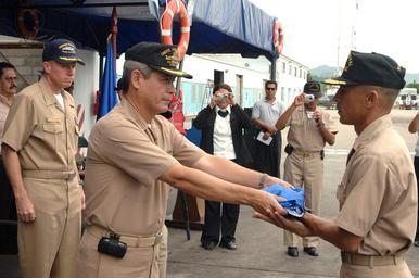 | Keywords: US Navy 070823-N-0989H-049 Capt. Douglas Wied, commander of Task Group (TG) 40.9, watches as the Honduran Chief of Naval Operations hands over the ceremonial flag to the commanding officer of the L.P. Guaynauras (FNH-1051).jpg en PUERTO CORTES Honduras Aug 23 2007 - Capt Douglas Wied commander of Task Group TG 40 9 watches as the Honduran Chief of Naval Operations hands over the ceremonial flag to the commanding officer of the L P Guaynauras FNH-1051 a Honduran patrol boat during a ceremony marking the beginning of the ship's participation in PANAMAX 2007 Task Group 40 9 is deployed under the operational control of U S Naval Forces Southern Command for the Global Fleet Station GFS pilot deployment to the Caribbean Basin and Central America The GFS mission is to conduct a broad range of theater security cooperation activities with regional maritime services U S Navy photo by Mass Communication Specialist 1st Class David Hoffman RELEASED 2007-08-23 070823-N-0989H-049 Navy http //www navy mil/view_image asp id 49963 U S Navy photo by Mass Communication Specialist 1st Class David Hoffman PD-USGov-Military-Navy Images from US Navy location Puerto Cortes Honduras PANAMAX 2007 |