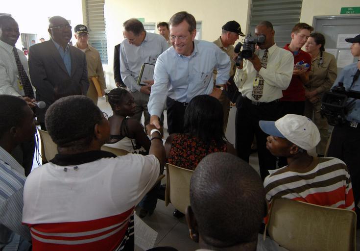 Keywords: US Navy 070907-N-0194K-202 Secretary of Health and Human Services, Michael Leavitt speaks with Haitian patients awaiting medical care during his tour of the Military Sealift Command hospital ship USNS Comfort (T-AH 20) medical.jpg en PORT-AU-PRINCE Haiti Sept 7 2007 - Secretary of Health and Human Services Michael Leavitt speaks with Haitian patients awaiting medical care during his tour of the Military Sealift Command hospital ship USNS Comfort T-AH 20 medical site at Hôpital Universitaire de la Paix Comfort is on a four-month humanitarian deployment to Latin America and the Caribbean providing medical treatment in a dozen countries U S Navy photo by Mass Communication Specialist 2nd Class Steven King RELEASED 2007-09-07 070907-N-0194K-202 Navy http //www navy mil/view_image asp id 50655 U S Navy photo by Mass Communication Specialist 2nd Class Steven King PD-USGov-Military-Navy USNS Comfort in Haiti 2007 Hôpital universitaire de la Paix Port-au-Prince Journalism in Haiti 2007 in Port-au-Prince Michael O Leavitt |
