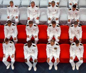 Keywords: US Navy 070921-N-8047K-949 Members of Officer Candidate School Class 20-07, the last class of officer candidates to graduate from Officer Training Command Pensacola, are seated during their commissioning ceremony at the Nationa.jpg en PENSACOLA Fla Sept 21 2007 Members of Officer Candidate School Class 20-07 the last class of officer candidates to graduate from Officer Training Command Pensacola are seated during their commissioning ceremony at the National Museum of Naval Aviation Class 20-07 commissioned 51 ensigns many of whom will continue their training as aviators or flight officers U S Navy photo by Larry W Kachelhofer RELEASED 2007-09-21 070921-N-8047K-949 Navy http //www navy mil/view_image asp id 51202 U S Navy photo by Larry W Kachelhofer PD-USGov-Military-Navy National Museum of Naval Aviation Sitting people Sitting with hand palms on each knee Red and white Rows Twelve people |