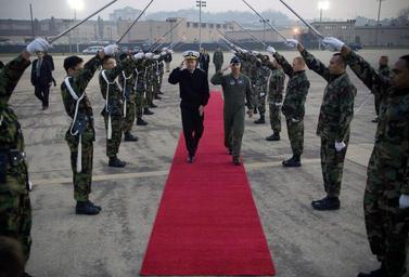 Keywords: US Navy 071107-N-0696M-357 Brig. Gen. Punch Moulton, vice commander of 7th Air Force, escorts Chairman of the Joint Chiefs of Staff, Adm. Mike Mullen through a Osan Air Base honor guard, prior to departing Osan Air Base.jpg en SEOUL Republic of Korea Nov 7 2007 - Brig Gen Punch Moulton vice commander of 7th Air Force escorts Chairman of the Joint Chiefs of Staff Adm Mike Mullen through a Osan Air Base honor guard prior to departing Osan Air Base and concluding a three-day visit to Korea Mullen participated in talks discussing the progress of transferring wartime operational control of Korean troops to Seoul and held a town hall meeting with troops stationed Yongsan Army Garrison U S Navy photo by Mass Communication Specialist 1st Class Chad J McNeeley RELEASED 2007-11-07 071107-N-0696M-357 Navy http //www navy mil/view_image asp id 52531 U S Navy photo by Mass Communication Specialist 1st Class Chad J McNeeley PD-USGov-Military-Navy Images from US Navy location Osan Republic of South Korea Michael G Mullen in 2007 Osan Air Base |