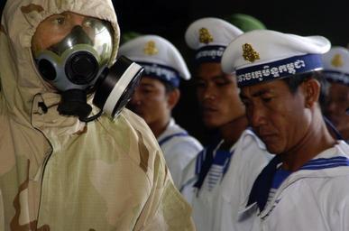 | Keywords: US Navy 071128-N-1242B-058 A U.S. Navy Sailor shows Royal Cambodian navy sailors the proper use of a full chemical-protective garment aboard the amphibious assault ship USS Essex (LHD 2).jpg  en SIHANOUKVILLE Kingdom of Cambodia Nov 28 2007 A U S Navy Sailor shows Royal Cambodian navy sailors the proper use of a full chemical/protective garment aboard the amphibious assault ship USS Essex LHD 2 Seventy-five Royal Cambodian navy sailors visited Essex to learn basic damage control and tour the ship Essex and the embarked 31st Marine Expeditionary Unit arrived in Sihanoukville Kingdom of Cambodia Nov 26 for a scheduled port visit that gives Sailors and Marines the opportunity to participate in friendship-building community relations events medical and dental projects and professional exchanges Essex is the lead ship of the only forward-deployed U S Expeditionary Strike Group and serves as the flagship for CTF 76 the Navy's only forward-deployed amphibious force commander Task Force 76 is headquartered at White Beach Naval Facility Okinawa Japan with a detachment in Sasebo Japan U S Navy photo by Mass Communication Specialist 1st Class Jeffrey Ballge Released 2007-11-28 071128-N-1242B-058 Navy http //www navy mil/view_image asp id 53184 U S Navy photo by Mass Communication Specialist 1st Class Jeffrey Ballge PD-USGov-Military-Navy Military of Cambodia Aboard USS Essex LHD-2 Males wearing gas masks MCU-2/P Protective Mask Military protective clothing |