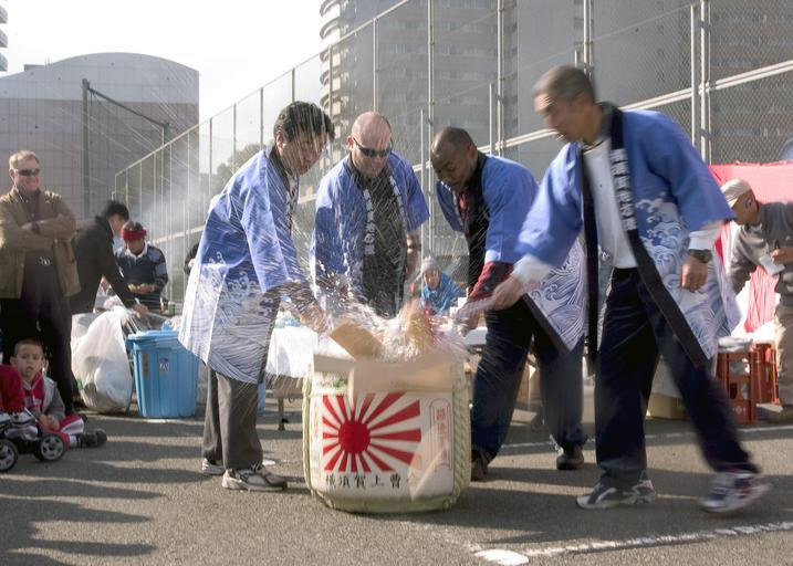 | Keywords: US Navy 071201-N-7446H-060 Chief petty officers from the U.S. Navy and the Japan Maritime Self-Defense Force (JMSDF) use mallets to break open a sake barrel during a mochi-pounding celebration at the JMSDF Yokosuka base.jpg en YOKOSUKA Japan Dec 1 2007 Chief petty officers from the U S Navy and the Japan Maritime Self-Defense Force JMSDF use mallets to break open a sake barrel during a mochi-pounding celebration at the JMSDF Yokosuka base Mochi is a traditional Japanese food made by pounding cooked rice with wooden mallets The celebration was a cultural event to promote teamwork between the two forces U S Navy photo by Mass Communication Specialist 2nd Class Derek J Hurder Released 2007-12-01 071201-N-7446H-060 Navy http //www navy mil/view_image asp id 53497 U S Navy photo by Mass Communication Specialist 2nd Class Derek J Hurder United States Fleet Activities Yokosuka Kagami biraki Sake PD-USGov-Military-Navy |