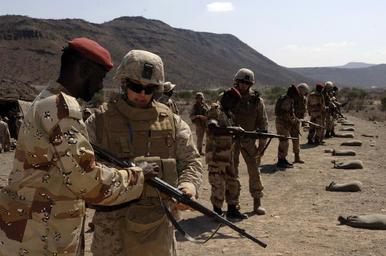 Keywords: US Navy 071210-F-0509T-006 Hospitalman 3rd Class Jeremy Jordon instructs a member from the Djiboutian Army on the PK-M (Djiboutian firearm) at Arta Range TC-13.jpg en DJIBOUTI Dec 10 2007 Hospitalman 3rd Class Jeremy Jordon instructs a member from the Djiboutian Army on the PK-M Djiboutian firearm at Arta Range TC-13 Jordon is from the Battalion Landing Team 3rd Battalion 8th Marine Regiment Kilo Company 22 Marine Expeditionary Unit from the amphibious dock landing ship USS Gunston Hall LSD 44 During this training U S service members instruct the Djiboutian military on weapons fundamentals U S Air Force photo by Senior Airman Jamie Train Released 2007-12-10 071210-F-0509T-006 Navy http //www navy mil/view_image asp id 53805 U S Navy photo PD-USGov-Military-Navy 3rd Battalion 8th Marines Males with assault rifles Army of Djibouti Type 56 rifle |